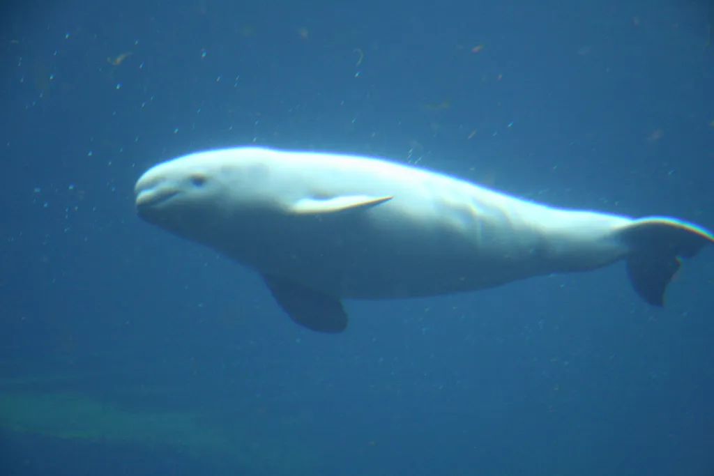 - Narwhal: Similar size and Arctic habitat, but narwhals have spots (not pure white), and males have a long tusk. Both lack dorsal fins.