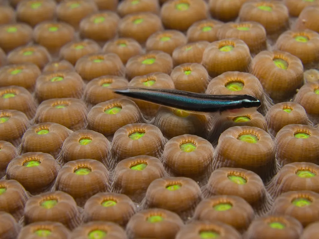 Neon gobies (Elacatinus species) have evolved into specialized cleaner fish - the aquatic equivalent of dental hygienists. These tiny, colorful gobies (usually under 5cm) establish "cleaning stations" on the reef where larger fish - including species that would normally eat them - visit to have parasites removed. The neon goby fearlessly enters the mouths and gills of predatory fish like groupers, moray eels, and barracudas, picking off parasites, dead skin, and debris. Their distinctive electric-blue stripe serves as a "uniform" signaling their cleaner status. This is a true mutualism: the goby gets fed, and the client fish gets groomed and stays healthy.