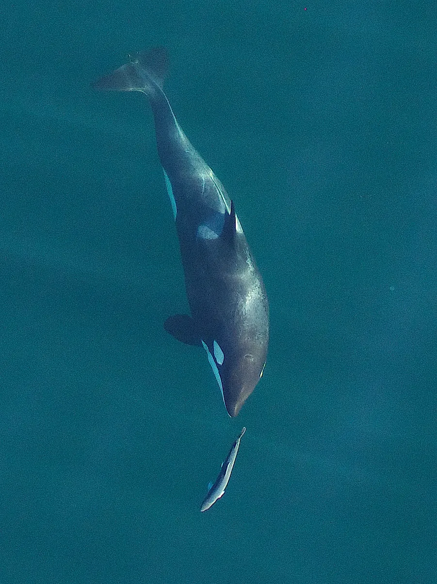 - Pilot Whale: Smaller; rounded head (no distinct beak); darker overall; sickle-shaped dorsal fin (not tall and straight).