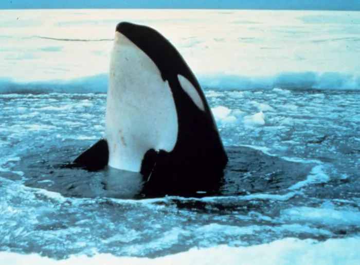 Orcas practice "spyhopping"—they raise their heads vertically out of the water to observe their surroundings. This behavior helps them locate prey on ice floes, check out boats, or simply satisfy their curiosity. It's a sign of their intelligence and awareness of their environment.