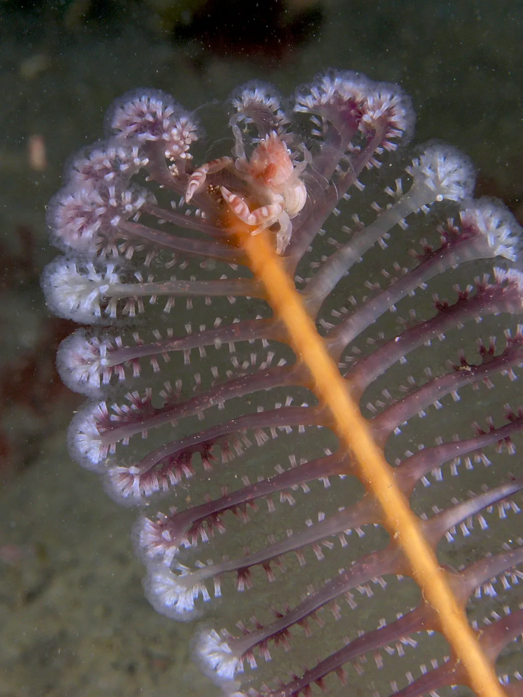 Sea pens represent one of nature's most elegant examples of colonial organization. Each sea pen colony begins as a single primary polyp that undergoes a remarkable transformation: it loses its tentacles and mouth, and instead develops into the central stalk (rachis) and anchoring base (peduncle). This primary polyp essentially becomes the foundation and support structure for the entire colony. Meanwhile, secondary polyps bud off from this central structure, each specializing in different functions. Autozooids are the feeding polyps—they have eight tentacles and capture plankton from the water. Siphonozooids are specialized for water circulation—they pump water through the colony to maintain structure and bring fresh water to feeding polyps. Reproductive polyps handle spawning. This division of labor is so complete that the colony functions as a single, integrated organism, even though it's made up of hundreds or thousands of individual polyps. For divers, understanding this colonial structure helps explain why sea pens look so different from other octocorals—they're not just branching colonies, but highly organized, functionally integrated communities where each polyp has a specific job. It's biological specialization taken to an extreme, and it's one of the reasons sea pens can grow so large and survive in challenging soft-bottom environments.